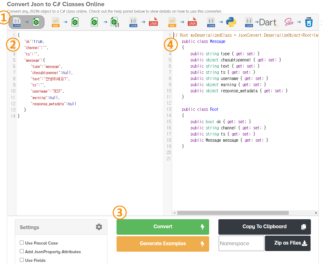 ① 에서 변환 할 언어를 선택한 후, ②에서 다른 형태로 변환 하고 싶은 데이터를 넣는다.