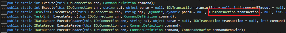 Dapper.dll 을 보시면, 동일 메소드가 오버로딩 되어 있습니다. 일반적으로 conenction 과 command 만 입력하는 메소드를 사용하셨다면, 이번에는 transaction 을 파라미터로 받는 메소드를 사용하면 됩니다.